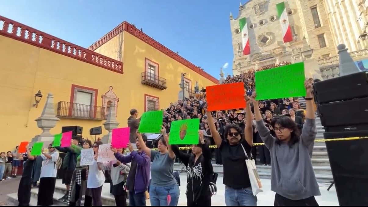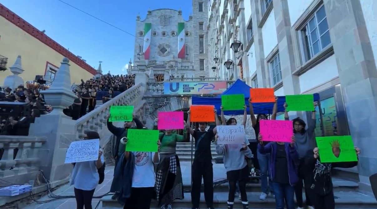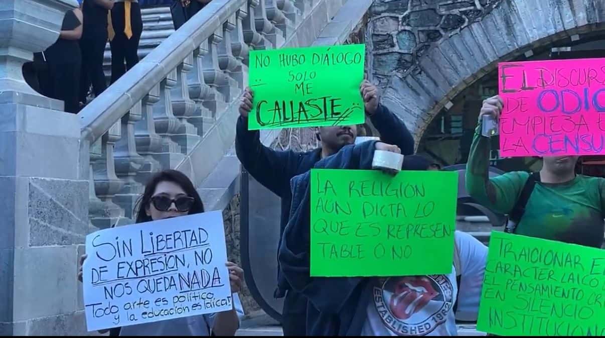 Por la tarde de este jueves, estudiantes de la Universidad de Guanajuato realizaron una protesta en la escalinata principal del edificio central en la capital del estado, luego de que se anunciara la cancelación anticipada de la exposición “Iconoclasia”. Con cartulinas que decían frases como “No hubo diálogo, solo me callaste”, “Sin libertad de expresión no hay nada” y “La religión aún dicta lo que es representable o no”, los jóvenes expresaron su inconformidad y exigieron respeto a la libertad de expresión dentro de la institución.