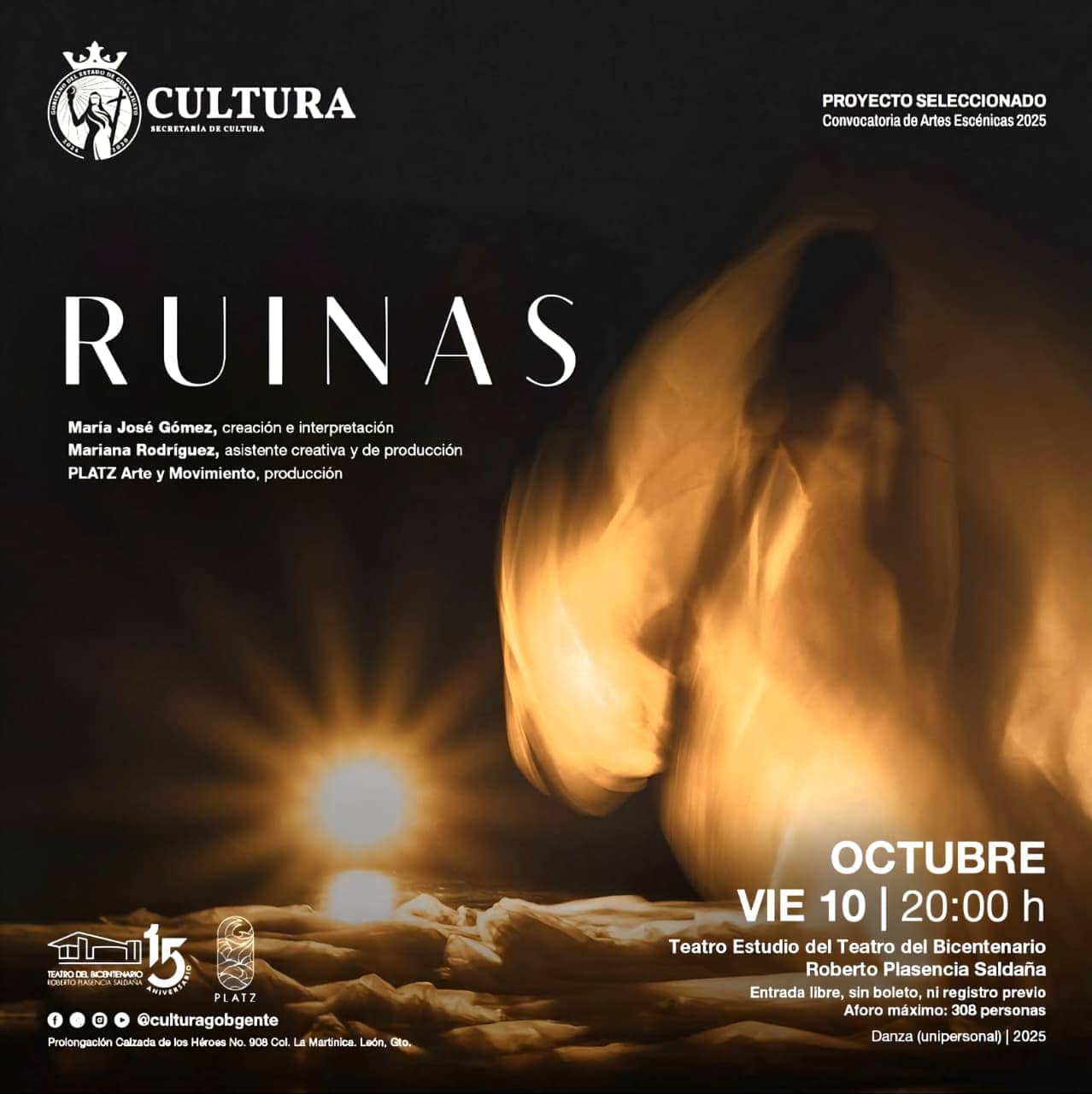 María José Gómez propone una coreografía donde el cuerpo dialoga con el espacio y el silencio; ruinas físicas y emocionales se entrelazan, y el espectador es conducido a reflexionar sobre las pérdidas, el paso del tiempo y la posibilidad de reconstrucción. La producción forma parte de la agenda cultural de octubre del Instituto Cultural de León.